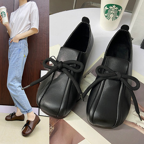 2021春季新款方头蝴蝶结单鞋女平底浅口软底豆豆鞋...