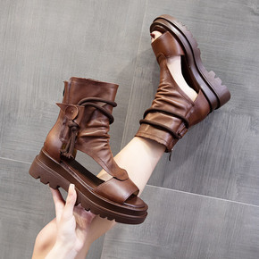 2022春夏新款真皮凉鞋女厚底松糕鱼嘴凉靴高帮平底...