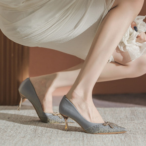 尖头高跟鞋女2021秋款新款气质蝴蝶结小跟鞋浅口粗...
