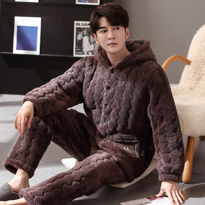 冬季睡衣男士三层夹棉加厚珊瑚绒连帽特厚可外穿冬天家...