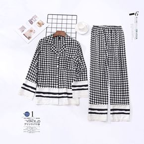 春秋款冰丝千鸟格睡衣女抖音直播爆款仿真丝绸情侣家居...