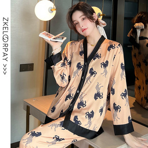 睡衣女夏季薄款冰雪丝长袖开衫印花套装感洋气时尚家居...