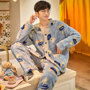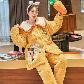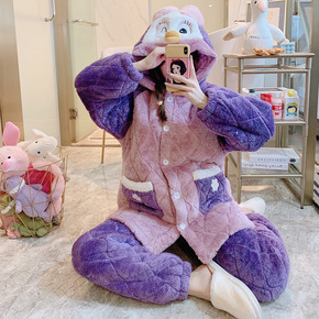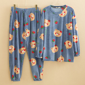 秋冬新款法兰绒睡衣女士长袖加绒卡通珊瑚绒可外穿家居...