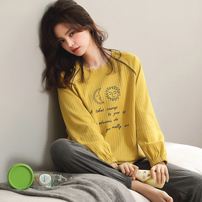 甜妹子长袖纯棉女士睡衣春秋季薄款坑条家居服可外穿可...