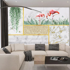 几何热带雨林植物5D火烈鸟墙纸抽象手绘清新叶子8D...