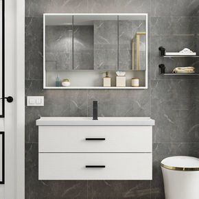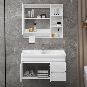 风格:简约 台面类型:一体陶瓷盆 柜体材质:三聚氰胺板 门板材质:三聚氰胺板 安装方式:挂墙...