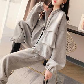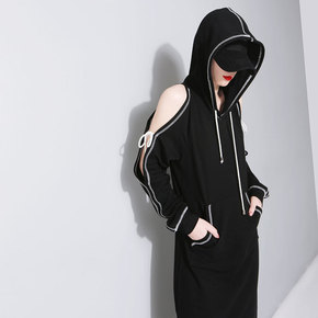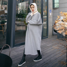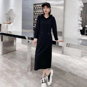 秋季大码女装2021新款连帽显瘦开叉长款卫衣裙过膝...