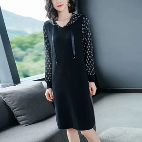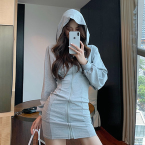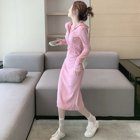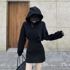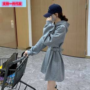 2022新款连帽卫衣裙子赫本风时尚收腰包臀连衣裙冬...