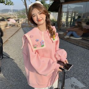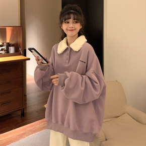 胖mm羊羔毛领加绒加厚卫衣女秋冬2021新款宽松外...