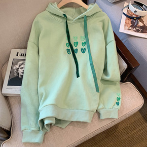 高品2022春秋季新款刺绣扣抹茶绿色连帽卫衣女套头...