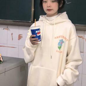 2021年新款加绒奶杏色花朵印花甜美卫衣女加绒慵懒...