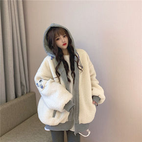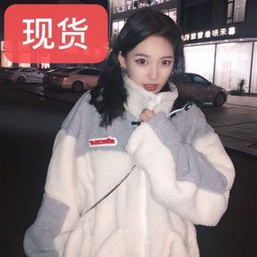 羊羔毛外套女韩版原宿BF拼色宽松学生开衫保暖大衣加...