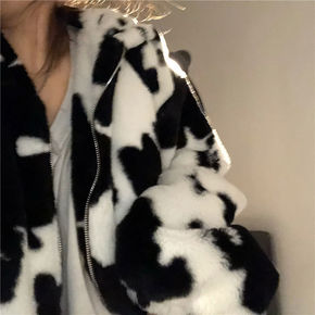 冬季新款毛茸茸加绒加厚奶牛纹连帽外套女韩版宽松学生...