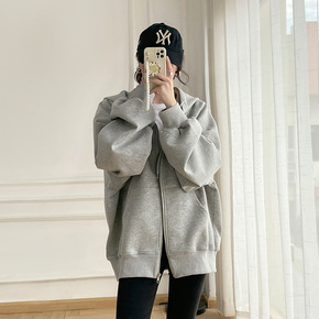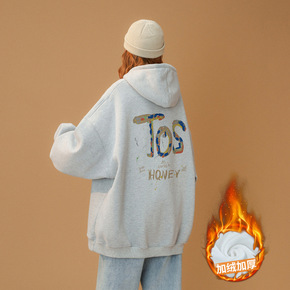 秋冬装韩版加绒仿棉复合310克重工连帽字母中长款卫...