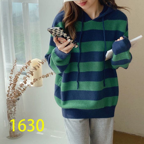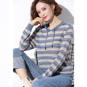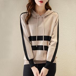 秋冬新款拼色卫衣针织羊毛慵懒条纹连帽卫衣针织套头打...