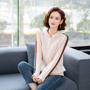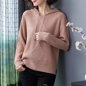 秋冬季连帽羊绒衫女短款套头宽松长袖毛衣显瘦针织打底...