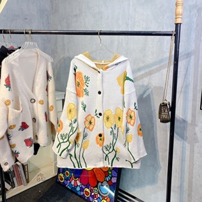 现货春暖花开2021秋冬新款复古花朵刺绣长袖针织开...