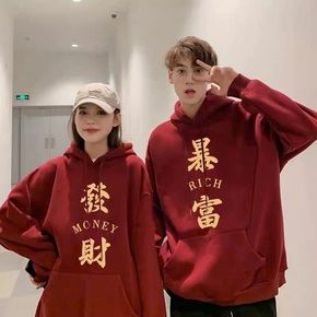 2021新款秋冬卫衣男国潮新年过年装酒红色连帽加绒...