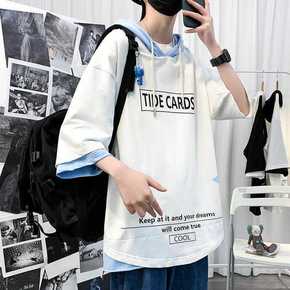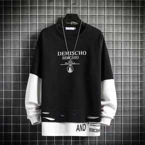 春秋季新款圆领长袖t恤男韩版潮流宽松假两件打底衫休...