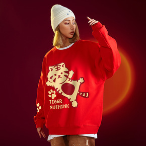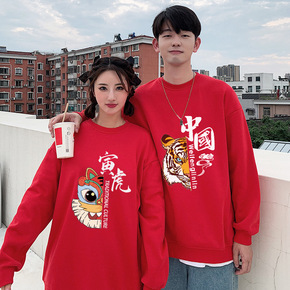 2022新年本命年老虎拜年红色卫衣男潮加绒加厚宽松...