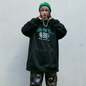 冬新款韩国ins美式复古原宿bf棋盘格字母印花加绒...