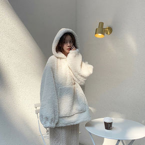 连帽仿羊羔毛新款宽松学生BF懒惰风潮加绒加厚卫衣女...