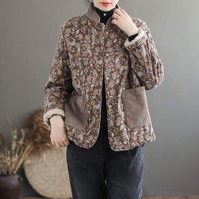 2021冬季复古拼色口袋碎花棉衣宽松随性家居保暖女...