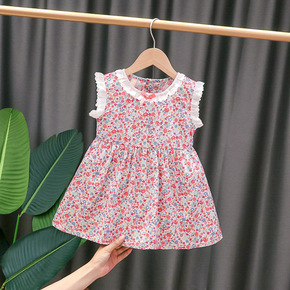 女童夏季连衣裙2020新款蕾丝边圆领印花无袖连衣裙...