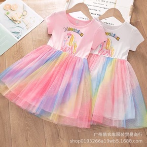 2020新款女童星星网纱裙渐变连衣裙卡通飞天小马印...