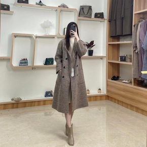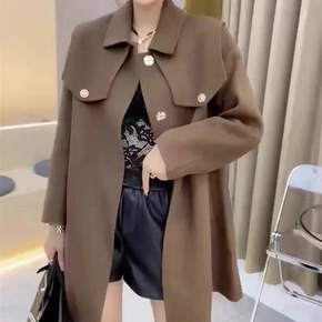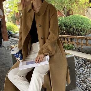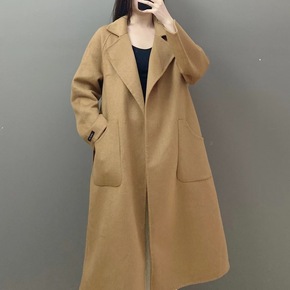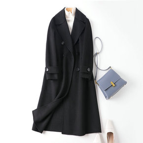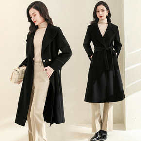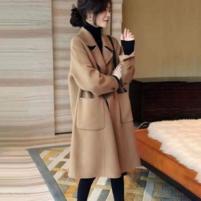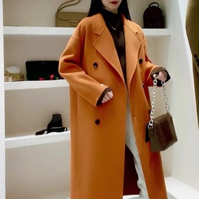 2022年秋冬新款韩版宽松长款双面手缝羊毛大衣女士...