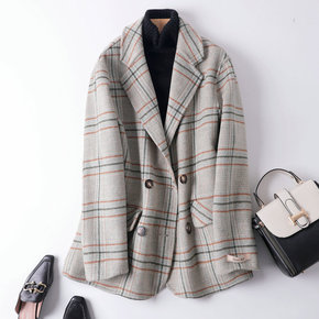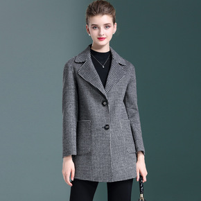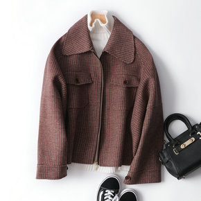 千鸟格子双面呢大衣女短款2020新款秋冬宽松羊绒小...