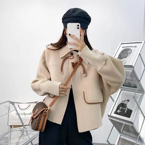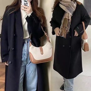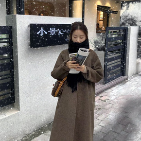 2022秋冬新款韩版女装宽松长款双面羊毛手缝外套大...