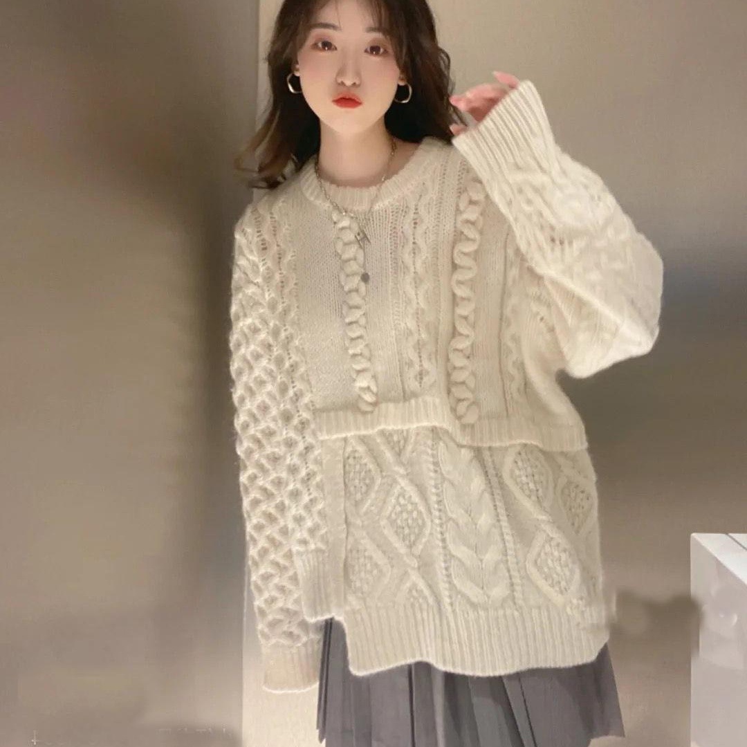 2021冬装新款复古宽松粗毛线镂空绞花不规则下摆慵...