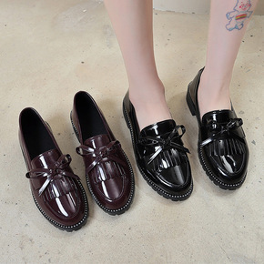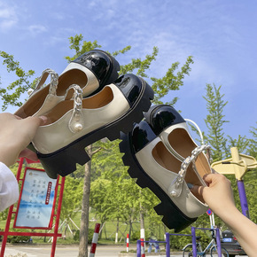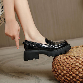 2021新款单鞋圆头链条厚底小皮鞋粗跟漆皮松糕鞋女...