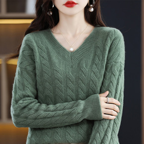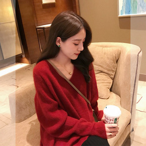 车厘子红色V领套头毛衣女宽松2021新款秋冬慵懒风...