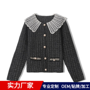 法式复古小香荷叶边娃娃领珍珠扣针织开衫厚毛衣女春季...