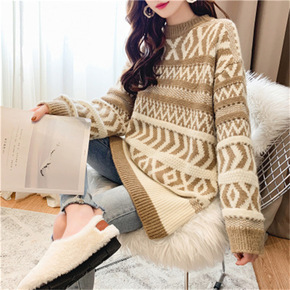 新款欧美洋气潮复古时尚拼色加厚粗针保暖套头冰岛慵懒...