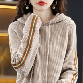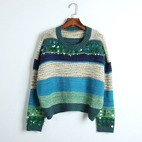 润施新款羊毛衫女V领宽松拼色条纹镂空羊毛针织衫长袖...