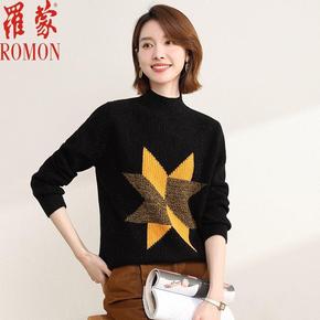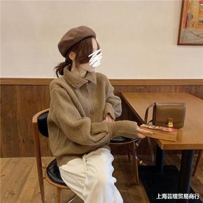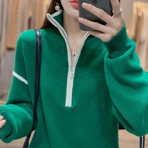 秋冬新款翻领羊毛衫女套头宽松针织衫长袖厚毛衣时尚撞...