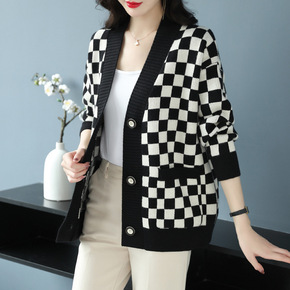 黑白格子针织开衫女春秋宽松拼色女装2022新款外搭...