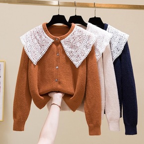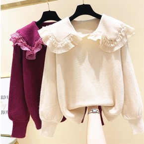 好美衣蕾丝花边拼接娃娃领套头毛衣女2021秋冬新品...