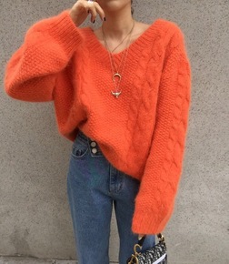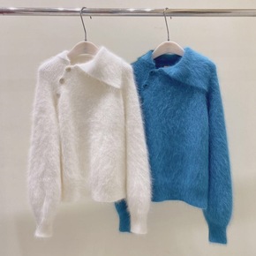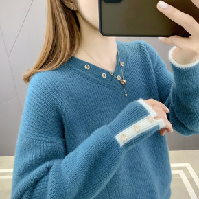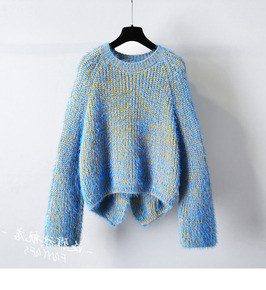 秋冬韩版圆领套头马海毛毛衣女宽松时尚撞色慵懒风加厚...