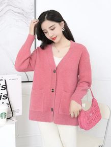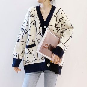 2021秋冬新款针织开衫外套女V领卡通小熊时尚提花...