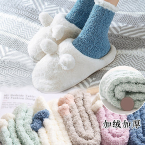 秋冬款地板袜子女加绒加厚保暖中筒居家袜纯色麻花珊瑚...