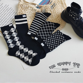 冬季新品袜子女中筒袜加绒加厚羊毛袜日系复古格子大牌...