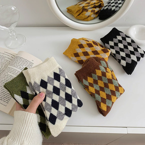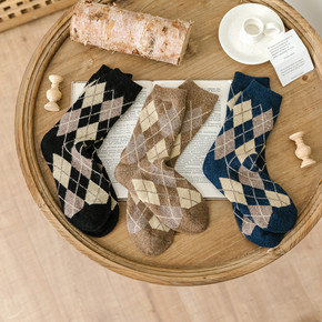 加厚袜子女日系复古菱形格羊毛中筒袜秋冬加绒保暖毛圈...