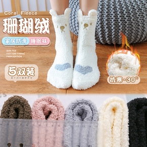 珊瑚绒袜子女秋冬卡通居家睡眠防滑地板袜毛巾加绒加厚...