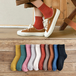 毛圈袜子女中筒袜秋冬加绒加厚日系纯色韩版韩国长袜毛...