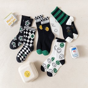 网红棋盘形状方格子黑绿笑脸女士加厚毛圈秋冬ins潮...