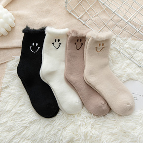冬季新品加厚女袜日系加绒加厚保暖中筒袜拉毛卡通笑脸...